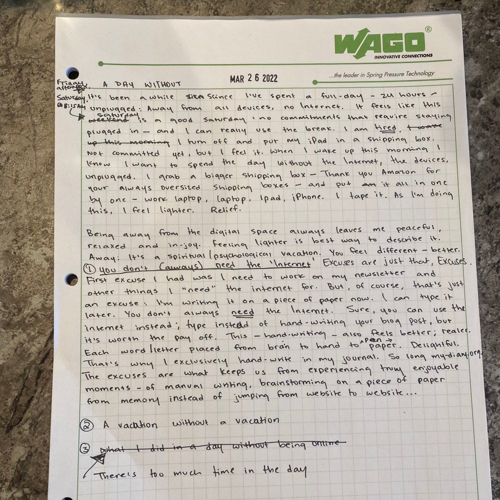 Excuses are just that, excuses; first lesson. That Saturday, I had plans to work on my newsletter and write a blog post. I felt anxious: How am I going to do any of that without my laptop and access to the Internet? I knew there had to be a way and I found it to be a very simple solution: A pen and paper. Just like that, I began drafting a blog post- this blog post- on a piece of paper. The idea that we need a digital device or the internet to be productive is not always necessarily true. It’s mostly an excuse. Sure, it is more convenient to be able to type than write things down manually then type it out, but the ability to unplug, disconnect, and still get work done is a possibility. It’s the art of applying pen to paper. If I choose to, I can draft all my blog posts, newsletters, and so forth on a piece of paper. In doing so, I decrease the time I spend online while still getting work done. Any time spent offline is less time spent online; the simplest way of looking at digital well-being.